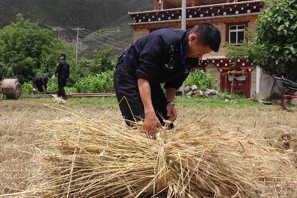 “不能讓鄧珠家成熟了的小麥爛在地里。”近期,巴塘縣陰雨天氣給當?shù)卮迕袷崭钚←湈聿槐恪T摽h夏邛派出所民警自發(fā)來到夏邛鎮(zhèn)河西村特困戶鄧珠家田地,以最快的速度幫助收割、捆綁、脫粒等一系列搶收工作。據(jù)悉,夏邛派出所民警在開展“一標三實”工作時,將當?shù)乩щy戶、殘疾戶、五保戶等缺少勞動力的家庭銘記在心,每逢播種秋收都會進行幫助。