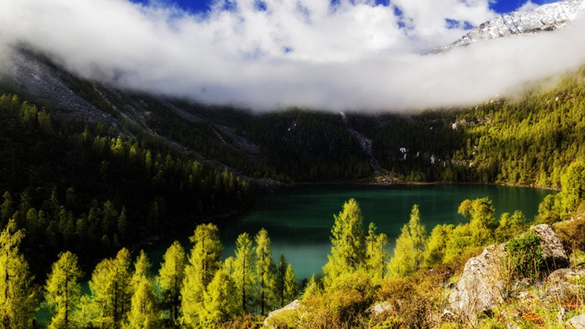深秋季節(jié),騎馬上山,穿過彩色秋林來到湖邊,但見雪山腳下,層巒疊嶂,落葉松間,一池秋水像一顆純凈的寶石,鑲嵌在嶙峋陡峭的高山峽谷中,偎依在茂密的原始森林旁,湖水倒映著藍天白云和金黃的落葉松,靜謐而神秘,散發(fā)著迷人的光芒。這里沒有絲毫人工打造的痕跡,這里沒有一點人間煙火的味道,這里就是一方充滿誘惑的世外桃源——道孚甲依拉措。