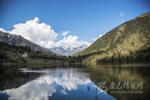藥池沸泉一側(cè)是風景秀美的俄瑪錯,上頂藍天白云和雪山,下踏森林綠水,讓人透心舒暢。