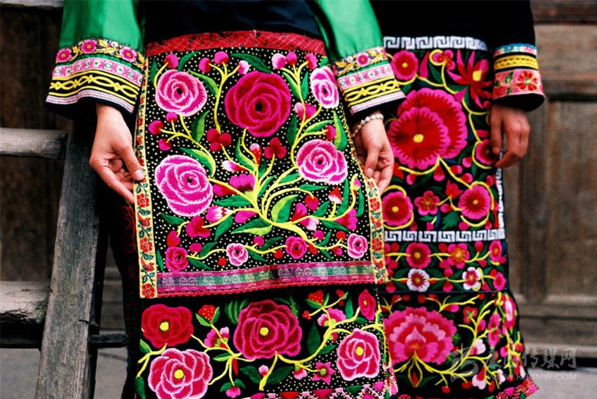 在這里,婦女們猶愛花草。所以,他們的刺繡作品,有生活的細(xì)節(jié)滲透,如氣息,若有似無,相互浸潤(rùn)。無論是花蔓纏枝,還是朵花團(tuán)簇,都從生活中提煉,視之便信手拈來,放在青布黑衫之上,鮮艷奪目,張顯著生活在這方水土之上,人們獨(dú)特的審美情趣。