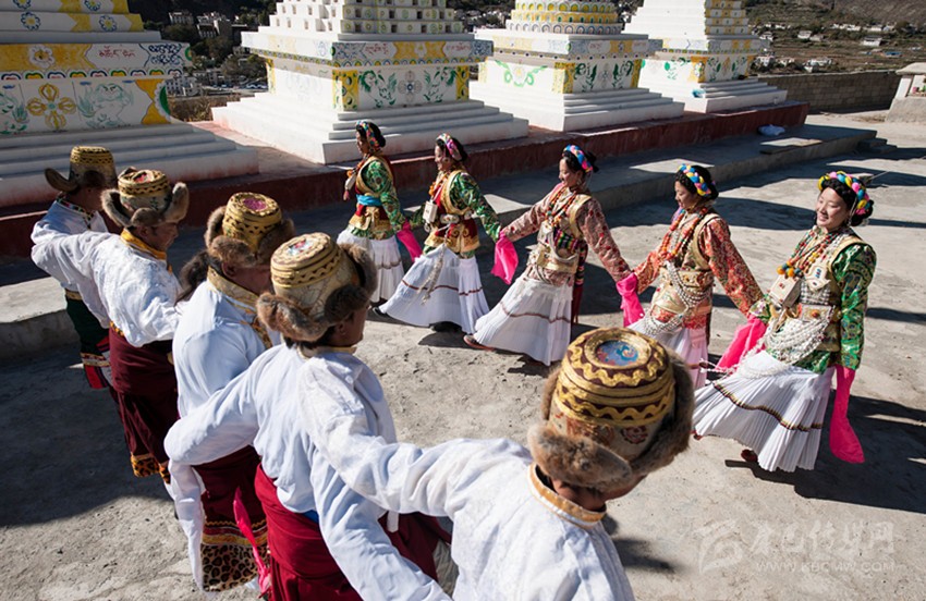 這當中最具有依憑的觀點是:“學(xué)羌”是藏族傳說人物江根阿坡創(chuàng)作的,他綜合了康巴三江沿岸的鍋莊與踏歌的舞步,又融入了滇西北少數(shù)民族的一些舞蹈元素。從歷史上看,得榮瓦卡(茶馬古道金沙江碼頭)曾是茶馬古道上的一座重鎮(zhèn),各民族的馬幫和商人曾集聚在瓦卡碼頭。或許,人們常常在這里載歌載舞,久而久之,在碰撞和交流中慢慢融合出了一個新的舞蹈:學(xué)羌。