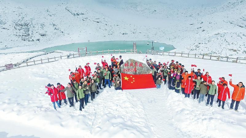 達(dá)古冰川管理局干部職工在海拔4860米的雪山之巔舉行“升國(guó)旗、唱國(guó)歌、慶國(guó)慶”活動(dòng)。銀琪攝