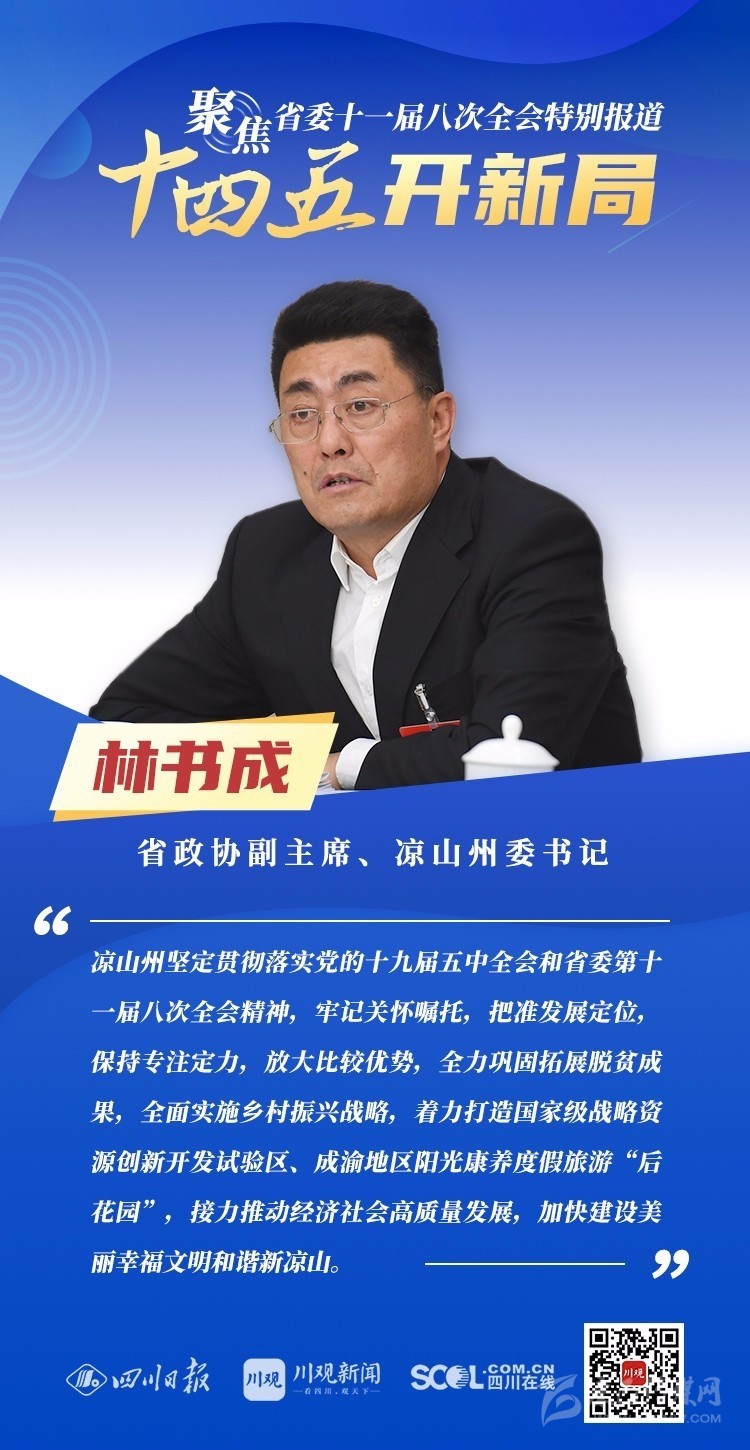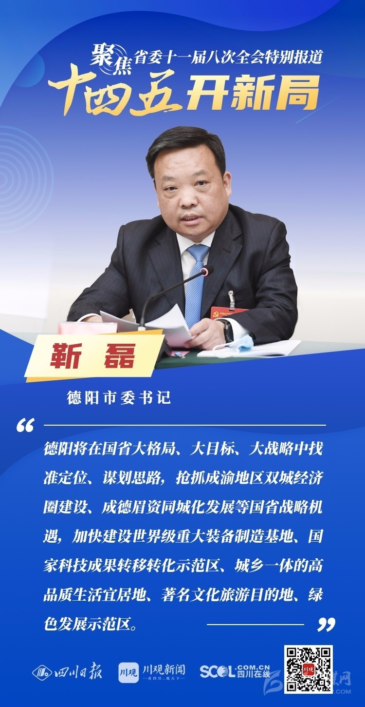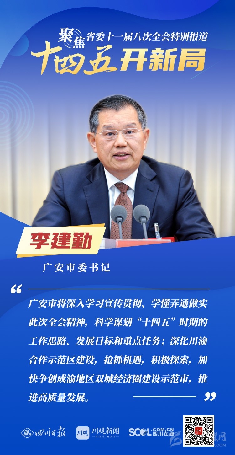 12月3日,中共四川省委十一屆八次全會在成都開幕,全會將深入學習貫徹黨的十九屆五中全會精神,審議《中共四川省委關于制定四川省國民經(jīng)濟和社會發(fā)展第十四個五年規(guī)劃和二〇三五年遠景目標的建議(討論稿)》,為未來5年乃至更長時期四川發(fā)展謀劃新藍圖 。