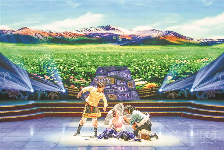 在團拜會節(jié)目演出環(huán)節(jié),隨著主持人一句“柳綠枝頭待燕歸,金雞賀歲開門紅”脫口而出,20余名活潑、歡快的少年涌上舞臺,就著音樂的節(jié)拍,揮手踏足、左挪右轉(zhuǎn),翩翩起舞;少年們舞動的長袖映著縷縷斑斕的光束,依如雄鷹在拍打著飛翔的翅膀。這便是此次演出的開場節(jié)目《雛鷹飛翔》,一場絢麗多彩的“甘孜春晚”由此火熱開演。隨后,一群體態(tài)輕盈、妝如仙鶴的女子用靈動的舞姿為甘孜祈福,點明了此次團拜會的一大主旨——祝福甘孜。