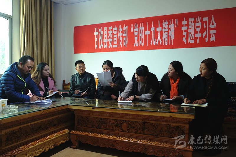 本網(wǎng)訊  (則瑪拉姆 文/圖)連日來(lái),甘孜縣依托中心組、干部講堂、“三級(jí)三講”等學(xué)教平臺(tái),圍繞“黨的十九大精神、《中國(guó)共產(chǎn)黨章程(修正案)》、習(xí)近平新時(shí)代中國(guó)特色社會(huì)主義思想、決勝全面建成小康社會(huì)”四大專(zhuān)題開(kāi)展學(xué)習(xí),采取專(zhuān)家輔導(dǎo)講、專(zhuān)題研討學(xué)、集中考學(xué)評(píng)等形式,迅速組織廣大黨員干部原原本本學(xué)、聯(lián)系實(shí)際學(xué)、突出重點(diǎn)學(xué),切實(shí)把黨的十九大精神轉(zhuǎn)化為謀劃發(fā)展的思路、促進(jìn)發(fā)展的舉措、領(lǐng)導(dǎo)發(fā)展的能力和推進(jìn)發(fā)展的合力。圖為116日下午,縣委宣傳部組織全體職工專(zhuān)題學(xué)習(xí)黨的十九大精神。
