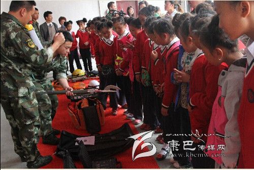 師生們?cè)诳刀h消防中隊(duì)副中隊(duì)長(zhǎng)李勇的帶領(lǐng)下,參觀了消防員宿舍、榮譽(yù)室、軍人俱樂(lè)部等。官兵們“豆腐塊”的被子引起了學(xué)生們濃厚的興趣和強(qiáng)烈的好奇心。不少孩子親自動(dòng)手,嘗試在消防官兵的指導(dǎo)下學(xué)習(xí)疊“豆腐”被子,并進(jìn)行了內(nèi)務(wù)整理。在消防器材展示環(huán)節(jié),師生們走進(jìn)車庫(kù),中隊(duì)官兵介紹了各類消防器材裝備的名稱、性能和使用方法以及各類消防車、隔熱服、避火服、防化服和背戴空氣呼吸器等特勤器材的性能和使用方法。在消防安全課堂上,官兵們向?qū)W生們播放了《校園消防安全警示錄》,并結(jié)合實(shí)際向同學(xué)們講解了學(xué)校防火的重要性、火場(chǎng)逃生自救方法、初期火災(zāi)的撲救、滅火器的使用、如何報(bào)火警等基本消防知識(shí)。在聯(lián)歡活動(dòng)現(xiàn)場(chǎng),消防官兵傾力打造的舞蹈《小蘋果Style》贏得同學(xué)們滿堂喝彩,現(xiàn)場(chǎng)響起熱烈的掌聲。學(xué)生們帶來(lái)的《吉祥中國(guó)結(jié),美滿中國(guó)夢(mèng)》跳出了小朋友們的美滿幸福之情。文藝演出的最后,消防官兵們還為學(xué)生們帶來(lái)了消防時(shí)裝秀,穿著各式服裝的消防戰(zhàn)士閃亮登場(chǎng),向孩子們講解了這些服裝在各種災(zāi)害事故現(xiàn)場(chǎng)的用途。